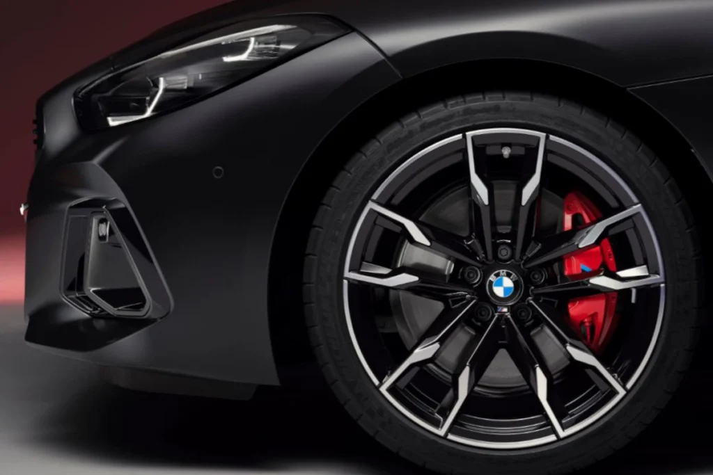 • Exterior Accents: The dark theme is reinforced with the Extended Shadowline Trim, blacking out the kidney grille, air breathers, and mirror caps. A touch of aggressive contrast is provided by the High-gloss Red M Sport brake calipers visible behind the staggered 19-inch front and 20-inch rear M-design wheels.